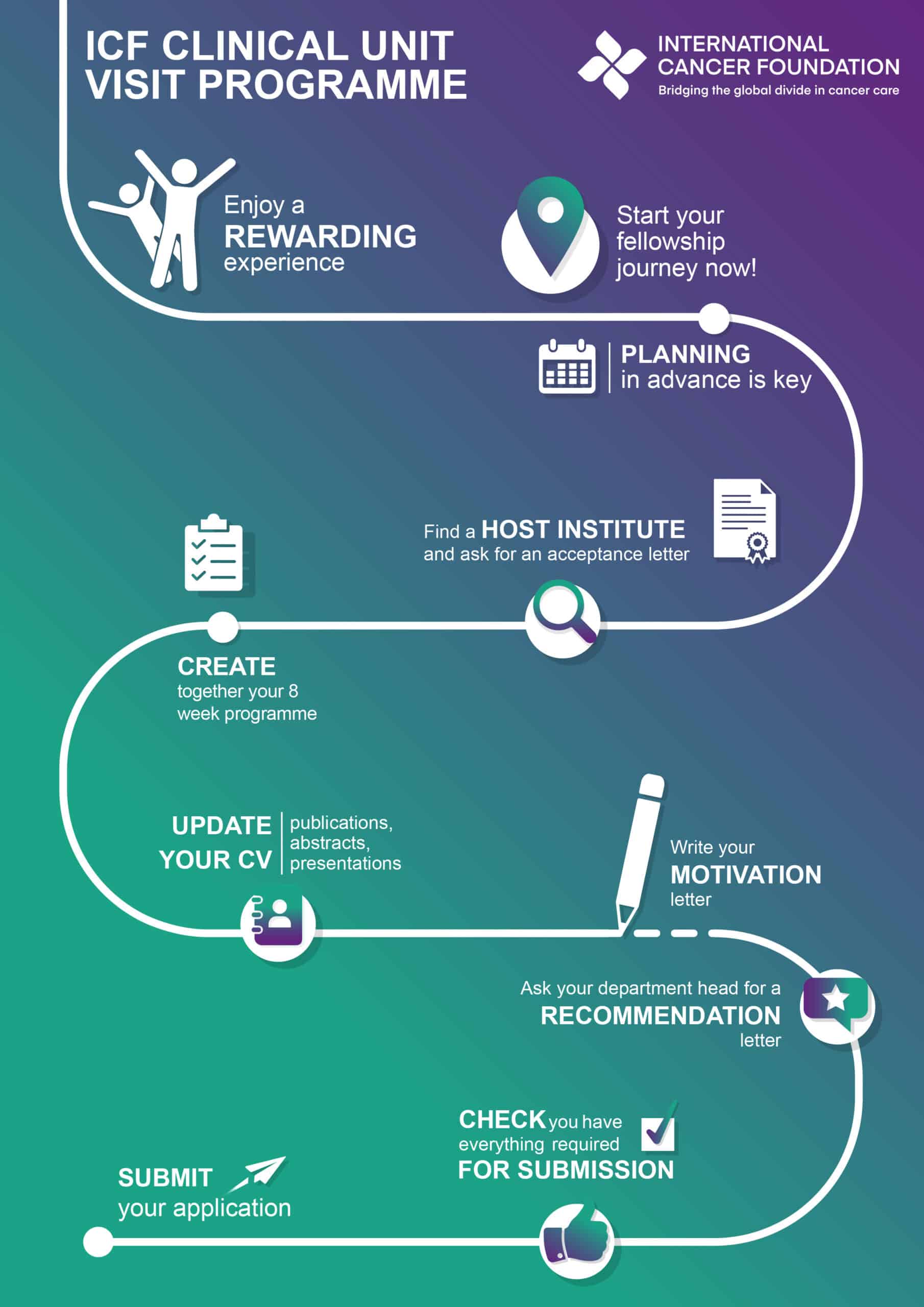 The ICF Clinical Unit Visit Fellowship is an eight-week training opportunity that enables young oncologists to gain hands-on experience in clinical oncology and research at a leading oncology centre of excellence to be approved by ICF. Supported by the International Cancer Foundation (ICF), the programme is designed to strengthen professional networks, enhance technical capacity, and promote the exchange of best practices across borders.